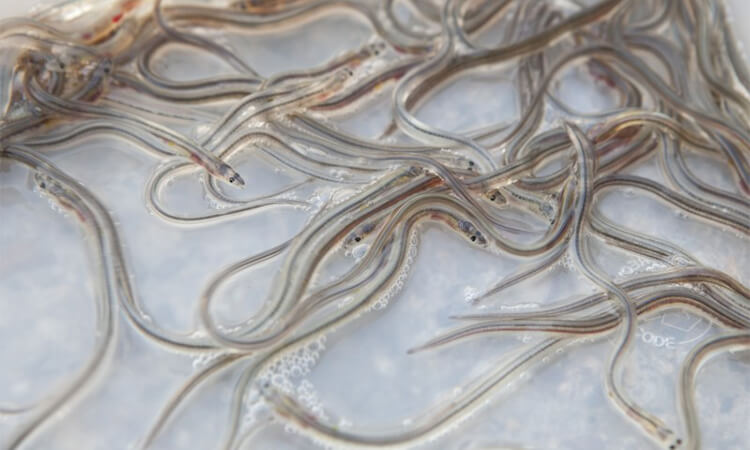 A container full of young glass eels