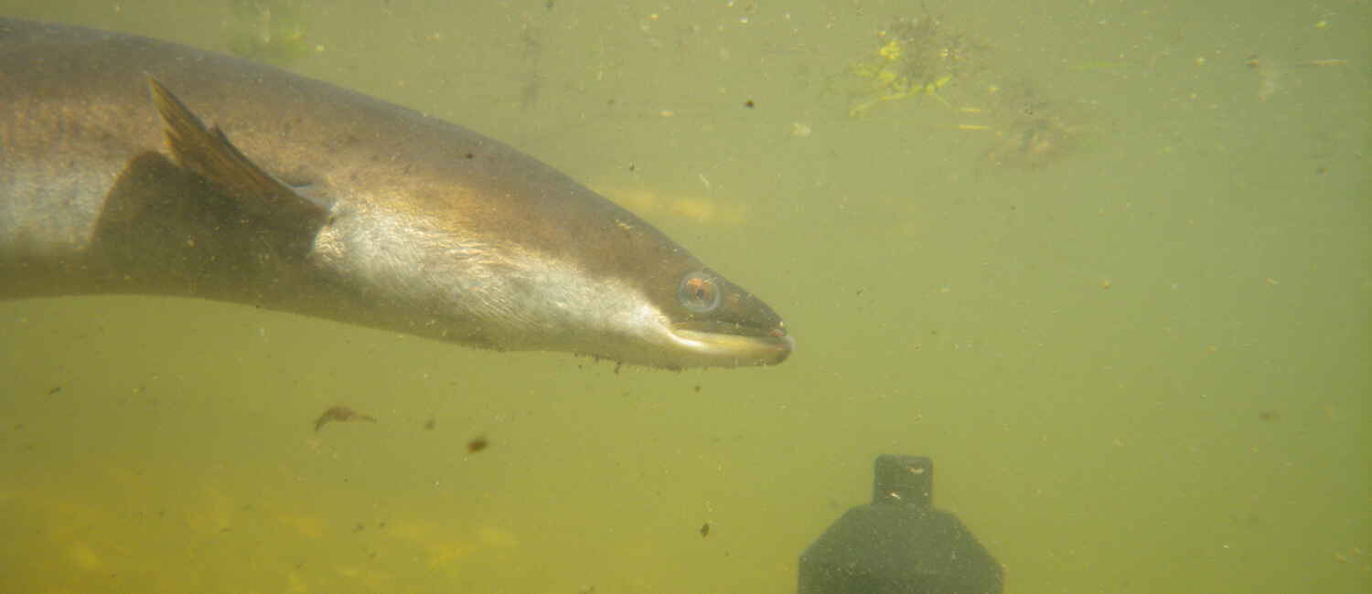 Silver eel swimming past an acoustic receiver