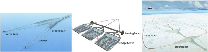 The physical impact of fishing gears on the seafloor is largely unknown. Commonly used demersal fishing gears are otter trawls, beam trawls and seines to catch demersal fish species and crustaceans and dredges to catch scallops. These fishing gears all consist of elements that are in contact with the seafloor.