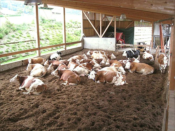 • Simmentaler cows resting on composting bedding in Austria