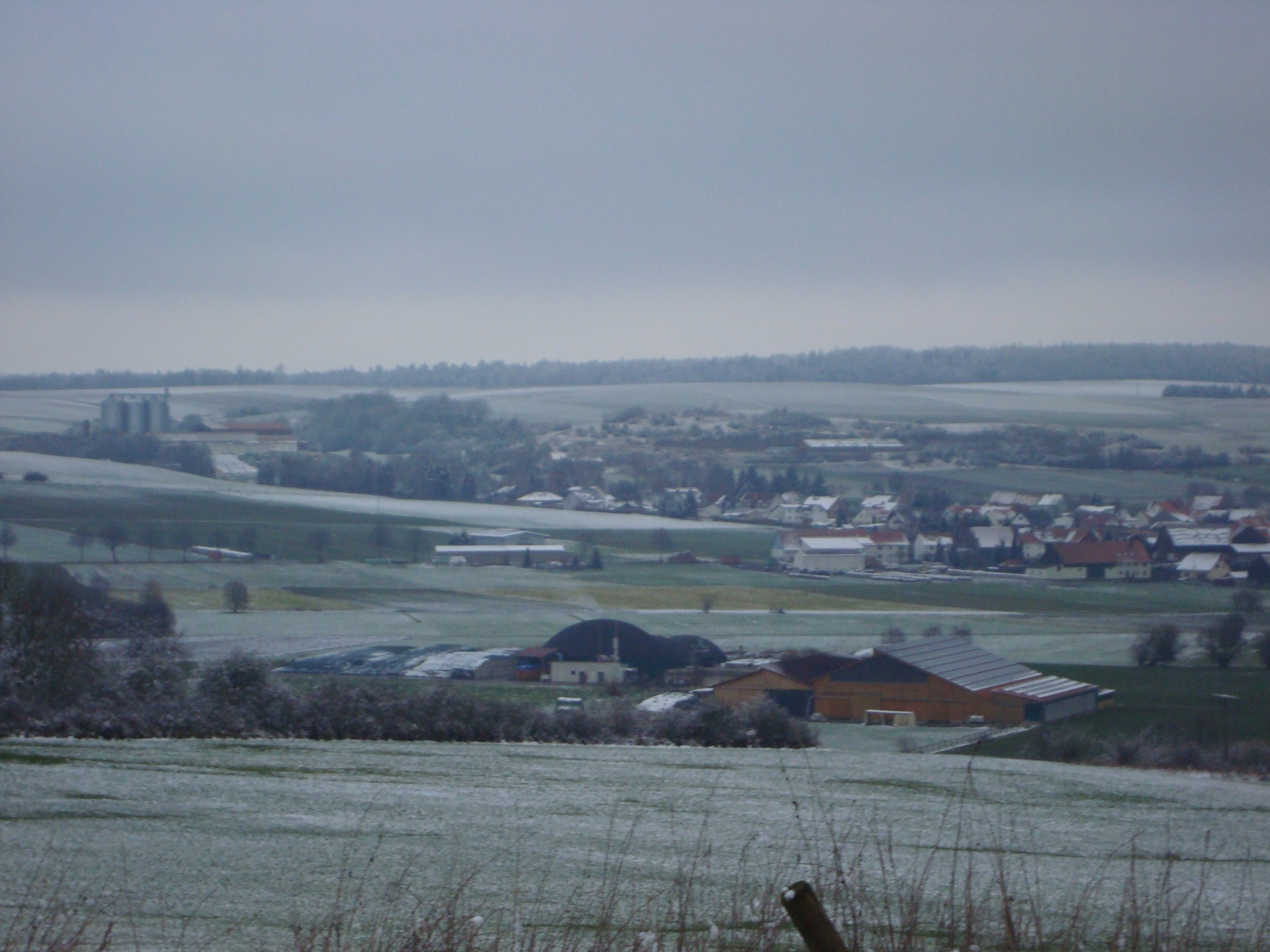 • View of the barn of Boss/Feik/Euler GbR operated by Gunther Boss in Lauterbach-Maar in Germany. In 2014, a composting stall (in centre of picture) was added to the cubicle barn combined with the calves rearing barn (on the right,) to improve animal welfare for the fresh lactating cows, and also a biogas plant (left) was built.