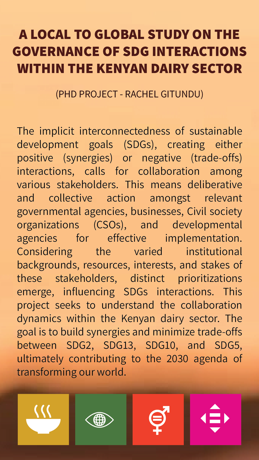 To contribute to finding solutions to this onerous governance challenge, this project begins from the local to the global level to answer the question; what role does power play in collaborations among public and private stakeholders of the Kenyan dairy sector and how does this impact interactions between SDG2, SDG13, SDG10 and SDG5?