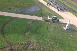 Rond het beeld de Zaaier voor het Atlasgebouw is een patroon aangebracht van lijnen. Hier zijn donderdag 24 november stroken van bloembolletjes ingeplant en Timoteegras gezaaid door de firma Donkergroen. De bollen en het gras vormen samen zogenaamde 'zaaisporen'.
