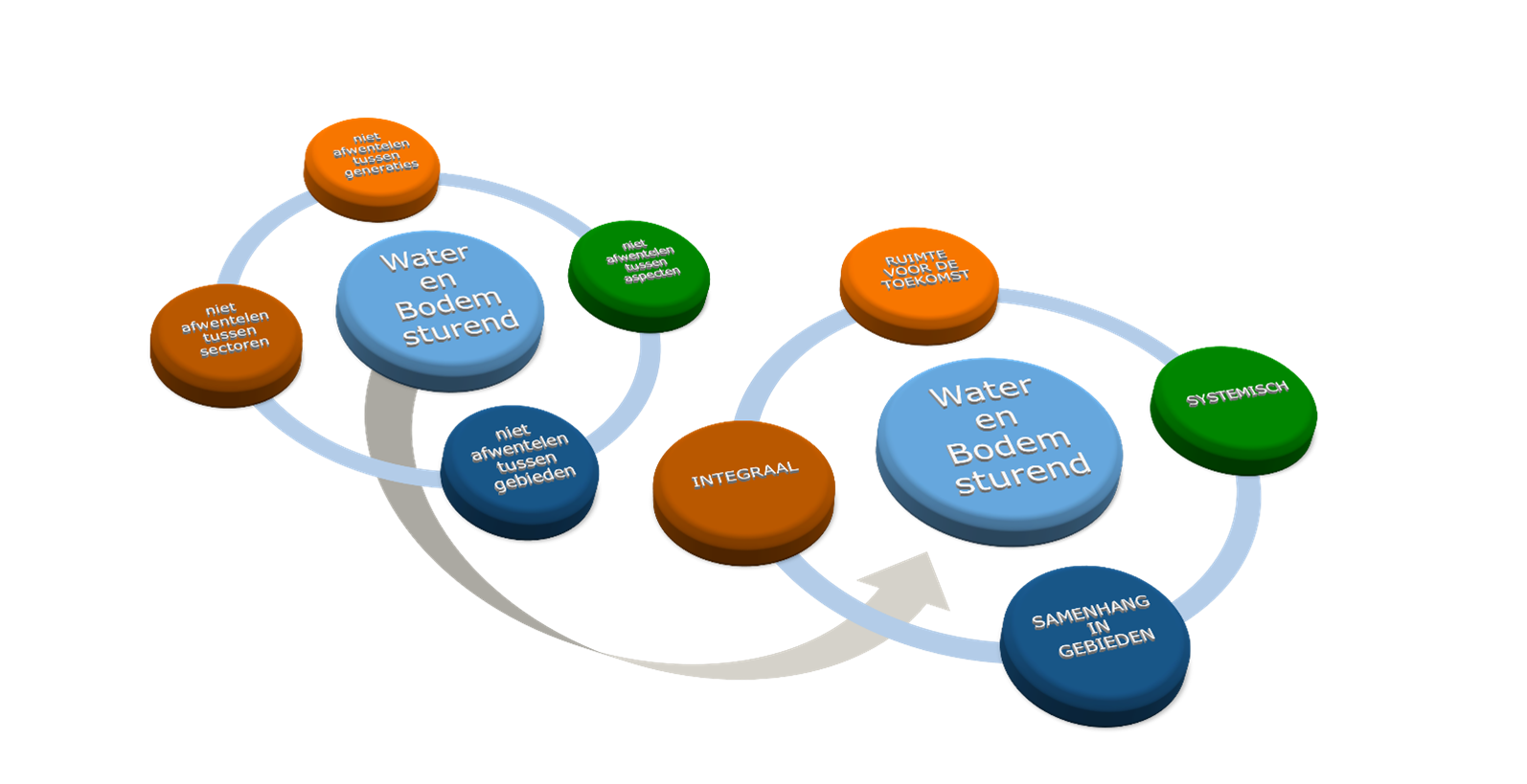 - ‘Water en bodem sturend’ wil zeggen dat het bodem-watersysteem een doorslaggevende rol speelt bij de inrichting van Nederland. Daardoor is ons land beter bestand tegen klimaatverandering en voorkomen we nog meer druk op de biodiversiteit. Het resultaat: een gezonde en veerkrachtige economie, maatschappij en leefomgeving.