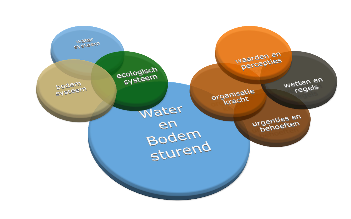 Met inzicht in het bodem-watersysteem alléén zijn we er niet. Uiteindelijk zijn het altijd mensen, die kennis moeten toepassen. En zoals dat gaat in de meeste besluitvormingsprocessen, spelen bij ruimtelijke vraagstukken veel belangen en afwegingen mee. Soms gaat het zelfs om politiek zeer gevoelige materie. Om water en bodem sturend te laten lukken, is het dus belangrijk dat we ook oog hebben voor de sociale en bestuurlijke kant van het verhaal. Welk draagvlak is er om bepaalde besluiten te nemen, wat en voor wie zijn de gevolgen, en hoe nemen we alle betrokkenen op een goede manier mee in het proces? Daarbij is het belangrijk om niet alleen naar de huidige belangen en belanghebbende te kijken maar ook die van de toekomstige generaties. De ruimtelijke keuzes die we nu maken kunnen immers nog generaties lang doorwerken.