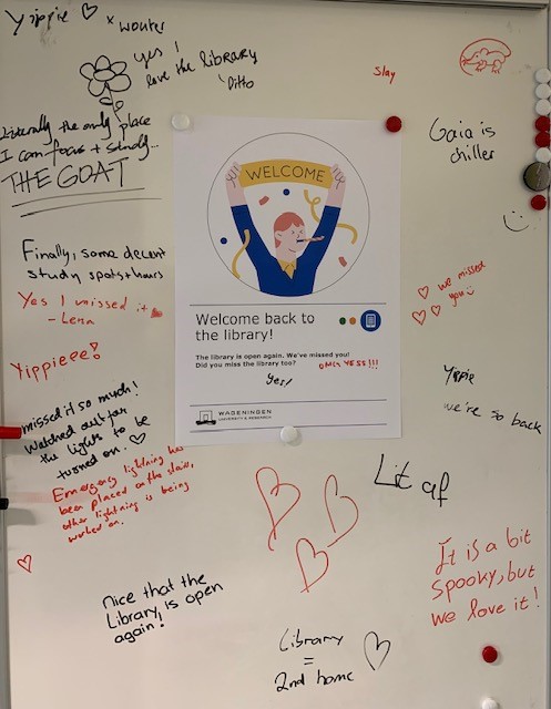 We willen iedereen nogmaals bedanken voor het geduld en de medewerking tot nu toe en voor de komende tijd. Op de foto kun je zien hoe blij sommige studenten waren dat ze weer naar de Library konden komen.
