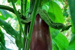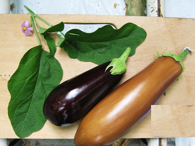 Aubergines worden in een onrijp stadium geconsumeerd; wanneer de vrucht de karakteristieke dieppaarse kleur heeft, zoals op de afbeeldingen. Voor zadenteelt laat je de vruchten wat langer hangen om te rijpen, waardoor ze een lichtbruine kleur krijgen en het vruchtvlees zacht wordt (op de afbeelding te zien voor erfgoedras Claresse).