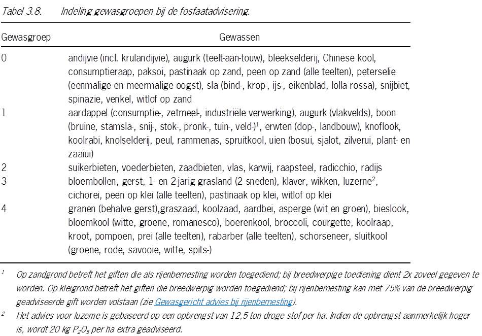 - Het heeft voordelen als in een bouwplan het fosfaat voor de niet-fosfaatbehoeftige gewas-sen (groepen 3 en 4) aan de fosfaatbehoeftige gewassen wordt gegeven. Bij een zeer lage fosfaattoestand kan het nodig zijn alle gewassen een fosfaatbemesting te geven.