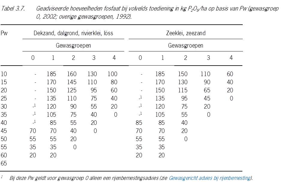 In Tabel 3.7 zijn de fosfaatgiften vermeld die nodig zijn om gegeven de fosfaattoestand van de bodem op basis van Pw-getal de economisch optimale opbrengst te bereiken met volvelds bemesting met fosfaat. Hierbij is rekening gehouden met zowel de marktbare opbrengst als de kosten voor fosfaatkunstmest.