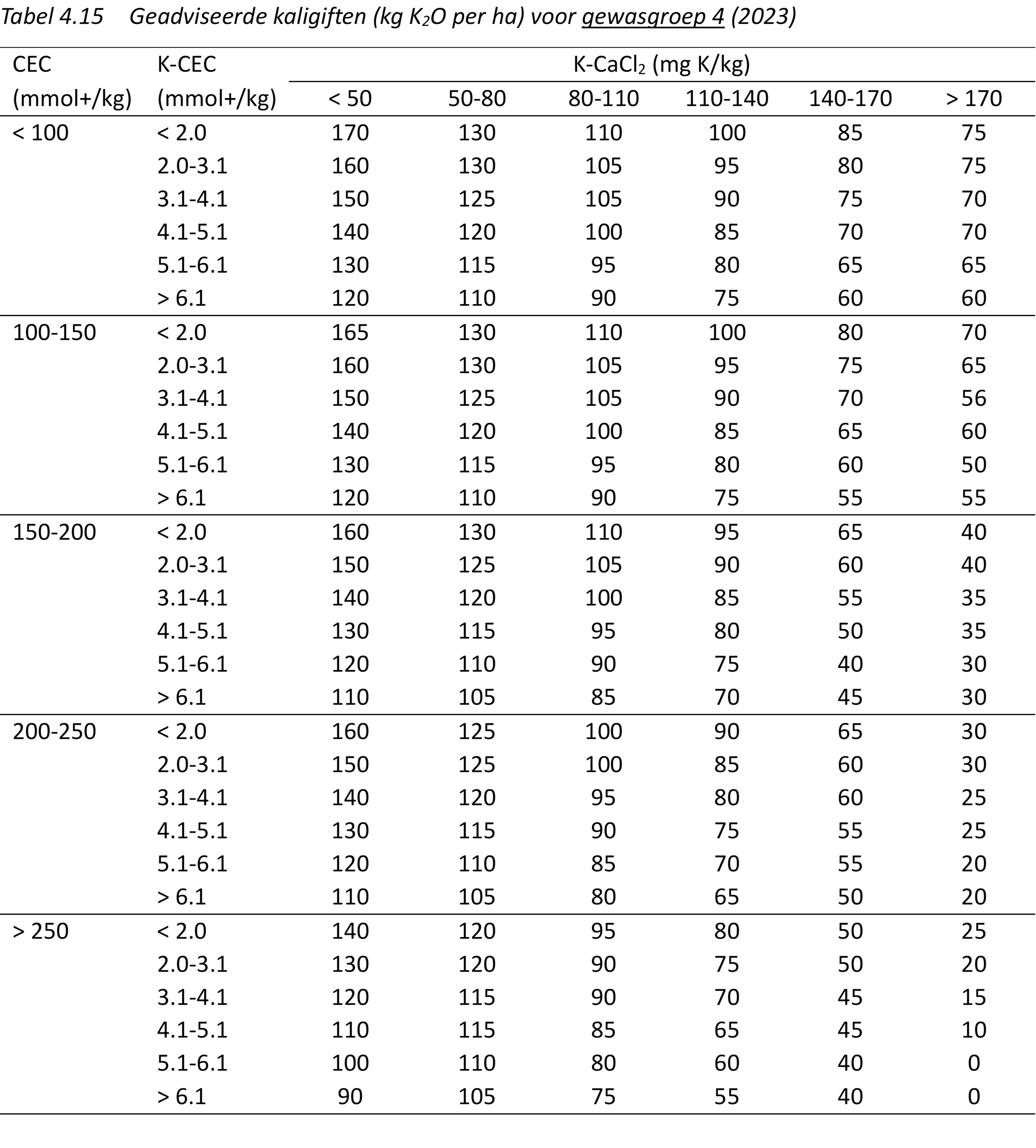 In de tabellen 4.12 t/m 4.15 worden de gewasadviesgiften kali vermeld, afhankelijk van de kalitoestand van de bodem op basis van K-CaCl2, CEC en K‑CEC. De gewassen zijn ingedeeld naar kalibehoefte in vijf gewasgroepen. De indeling in gewasgroepen is weergegeven in tabel 4.11.