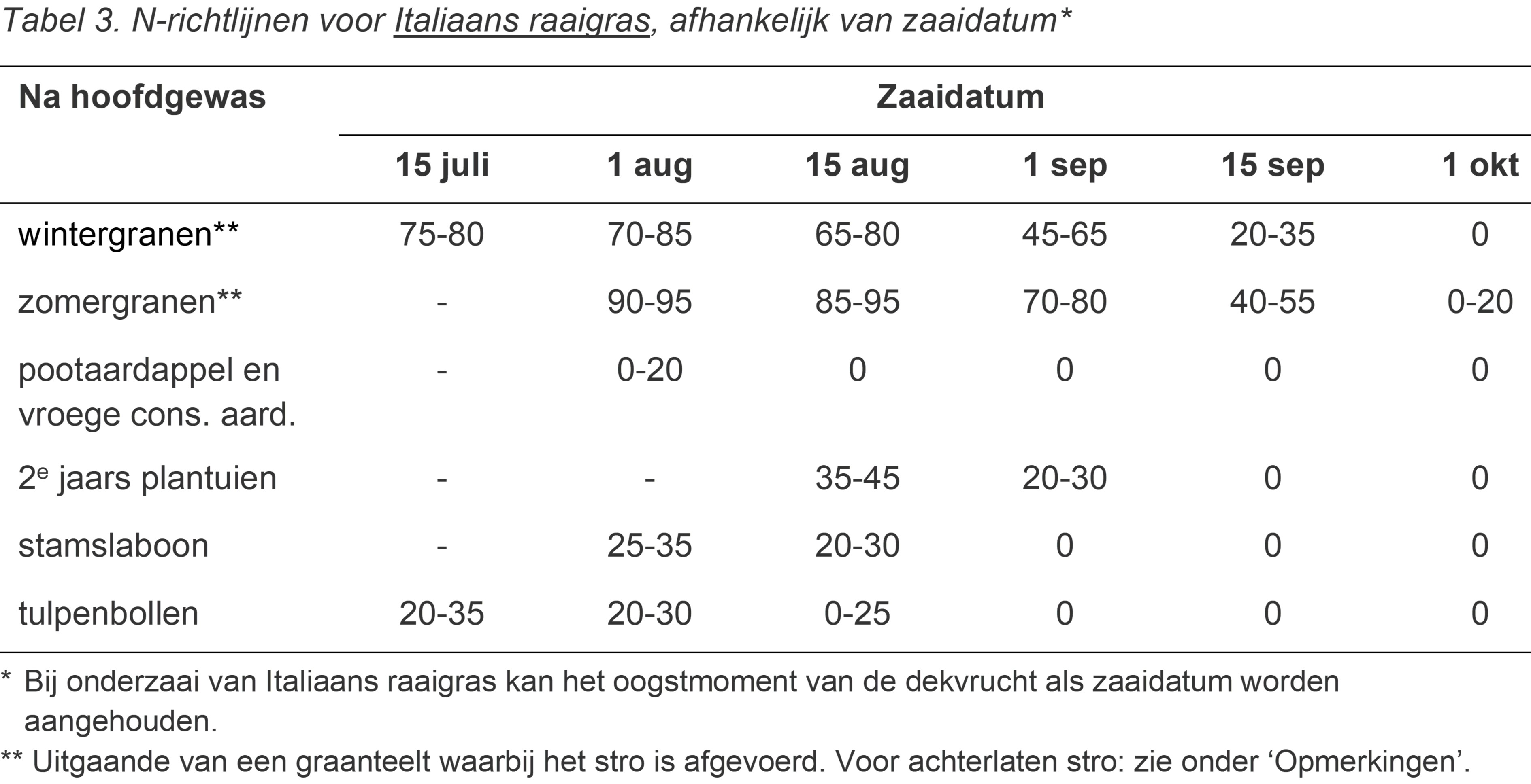 Er is voor Italiaans raaigras over het algemeen geen N-gift nodig na zaaiuien, doperwt, bruine boon, zomerveldboon, droge erwt, spinazie, ijssla, koolzaad.