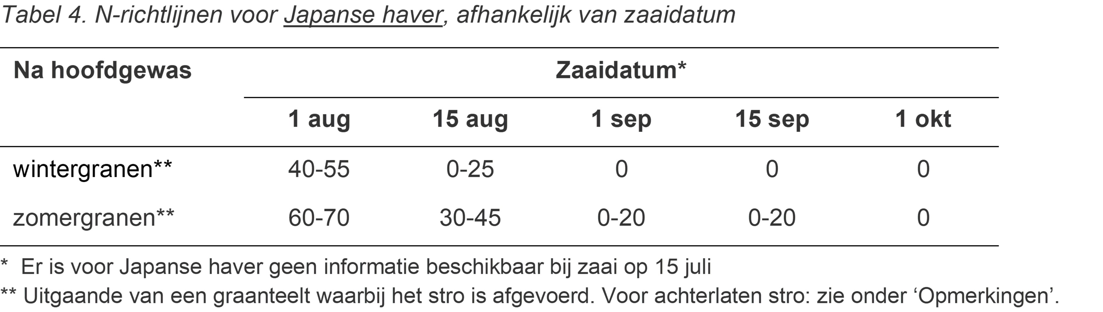 Er is voor Japanse haver over het algemeen geen N-gift nodig na pootaardappel, vroege consumptieaardappel, tulpenbollen, zaaiuien, plantuien, koolzaad, doperwt, stamslaboon, bruine boon, zomerveldboon, droge erwt, spinazie, ijssla.