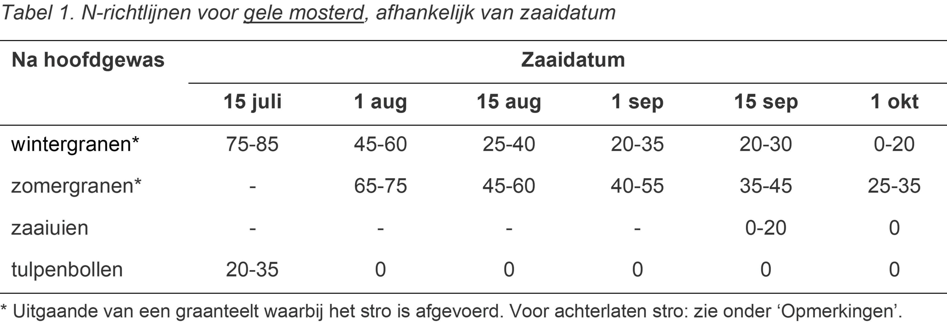 Er is voor gele mosterd over het algemeen geen N-gift nodig na koolzaad, pootaardappel, vroege consumptieaardappel, 2e-jaars plantuien, doperwt, stamslaboon, bruine boon, zomerveldboon, droge erwt, spinazie, ijssla.