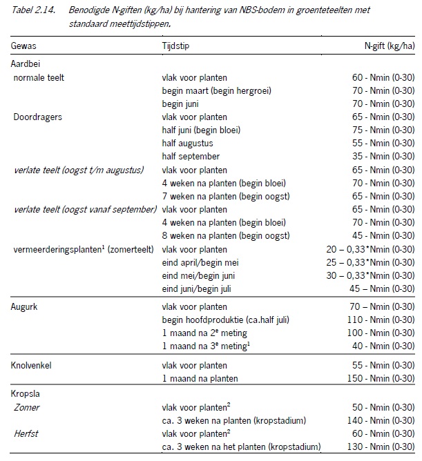 Bij het NBS-bodem kan men uitgaan van vaste meettijdstippen (standaardtijdstippen) of van zelf gekozen tijdstippen. Tabel 2.14 geeft de benodigde N-giften voor de verschillende groentegewassen wanneer gewerkt wordt met vaste, standaard meettijdstippen. Hierin zijn reeds de buffer en mineralisatie (alleen bij vermeerderingsteelt aardbeien) verwerkt.
