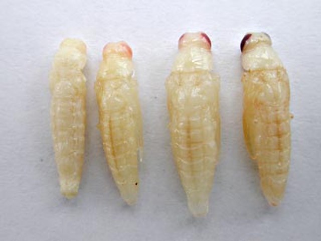 Jonge larven zijn circa 0,5 mm lang; volwassen larven zijn 30-36 mm lang. Larven hebben een crèmewit lichaam met een (licht) bruine kop. De kleine kop is teruggetrokken in de rest van het lichaam, waardoor alleen de bruine kaken goed zichtbaar zijn. De buik is gesegmenteerd in klokvormige leden. Aan het achtereind hebben de larven twee korte, bruine stekels.
