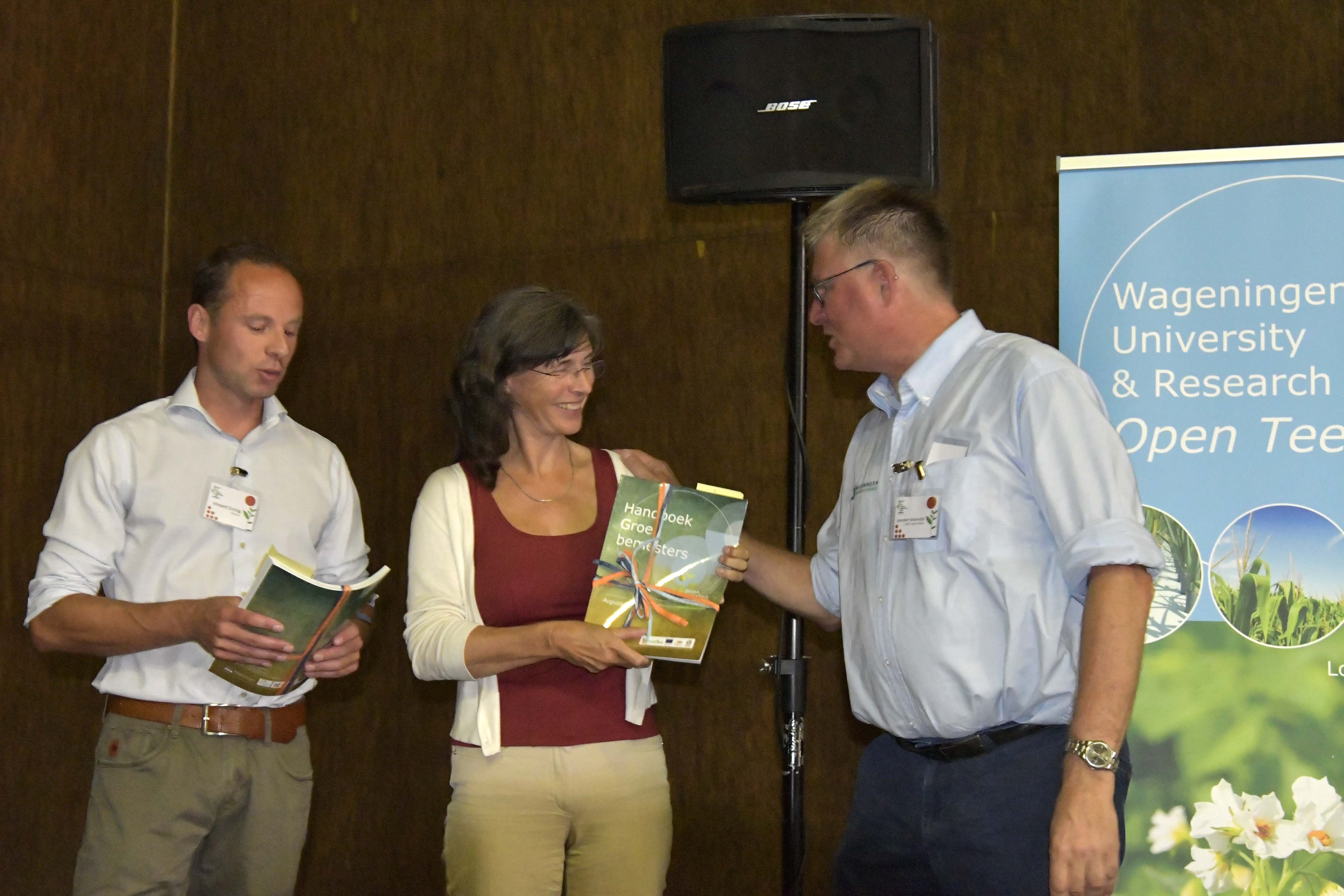 Overhandiging van het handboek aan Gera van Os en Vincent Enting door Leendert Molendijk
